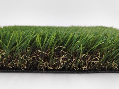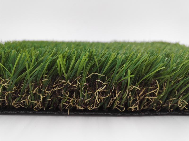 El césped sintético para jardinería 4QDSJJB se compone de monofilamentos rectos de doble tallo y monofilamentos curvos de dos colores, que forman un gramado de cuatro colores y distintas capas.
