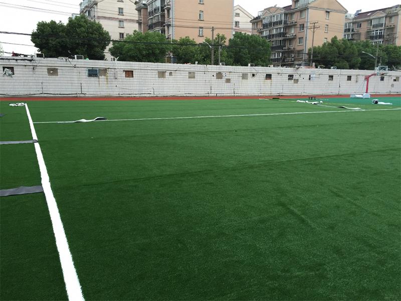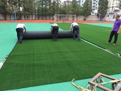 5. Dependiendo de la temperatura, humedad, presión del aire y otras condiciones, se recomienda mantener la temperatura ambiental del lugar de instalación del césped entre 0 y 40 ° C, controlar el tiempo de curado por aire y evitar la instalación bajo condiciones de lluvia y nieve. El tiempo de adherencia y secado debe ser de 10 a 15 minutos y el pegamento debe alcanzar un 80% o 90% de sequedad, de modo que pueda tocarse con la mano y sentirse seco. Durante el curado debe evitarse la exposición a la luz solar intensa, las inundaciones y el desplazamiento para garantizar que el césped adquiera unas excelentes condiciones. La unión firme del césped requiere la alineación y adhesión simultáneas. Luego del prensado y solidificación de la unión, es necesario golpear con firmeza la zona de unión con un mazo de goma especial durante el período de curado, que suele ser de 3 días.