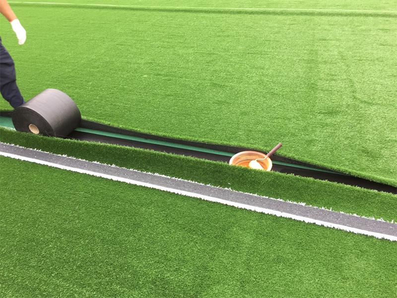 Antes de unir el césped artificial, es necesario recortar y corregir los bordes del césped. Para garantizar la suavidad la superficie debe carecer de rugosidades. La costura entre los rollos de césped no debe superar los 3 mm, y la cinta de costura debe colocarse por debajo. A continuación, con una brocha profesional aplique el pegamento para el fondo del césped y la cinta de costura, asegurándose que el espesor de la capa de pegamento sea uniforme; durante este proceso no debe pasarse la brocha repetidamente ya que el adhesivo podría desprenderse. La aplicación del pegamento debe hacerse con una temperatura y humedad estándar y con los elementos correctamente alineados.